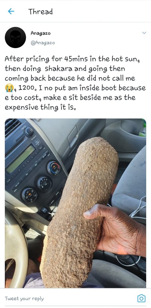 A Nigerian Man identified as @Anagazo on Twitter has lamented on the high cost of a yam he bought, IgbereTV reports.