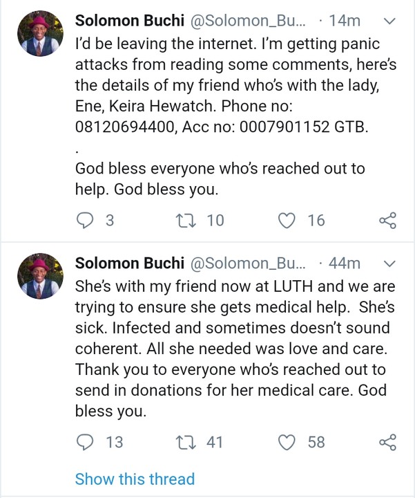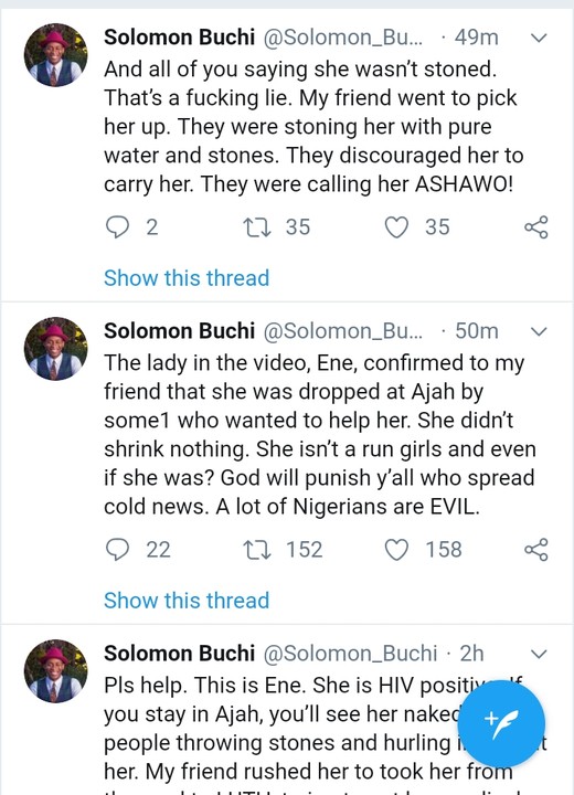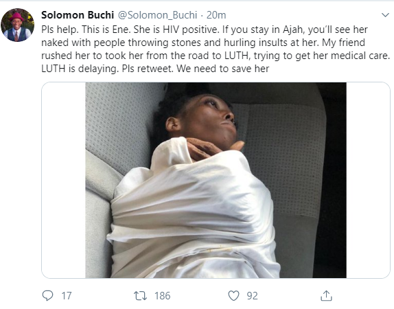Pls help. This is Ene. She is HIV positive. If you stay in Ajah, you’ll see her Unclad with people throwing stones and hurling insults at her. My friend rushed to take her from the road to LUTH, trying to get her medical care. LUTH is delaying. Pls retweet. We need to save her