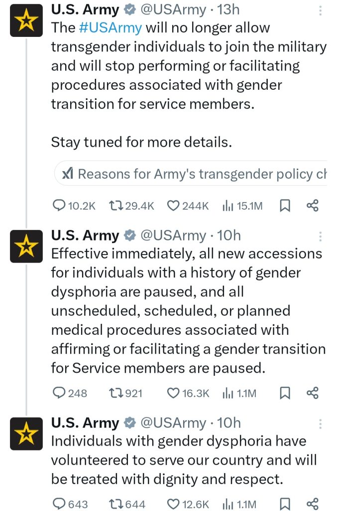 In a series of posts shared on X, the US Army wrote, “The #USArmy will no longer allow transgender individuals to join the military and will stop performing or facilitating procedures associated with gender transition for servicemembers. Stay tuned for more details.”