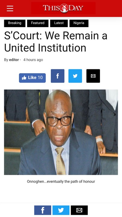 The Supreme Court said yesterday that it remains a united institution, denying a report that the reported resignation of the Chief Justice of Nigeria, Justice Walter Onnoghen, had ripped it apart.