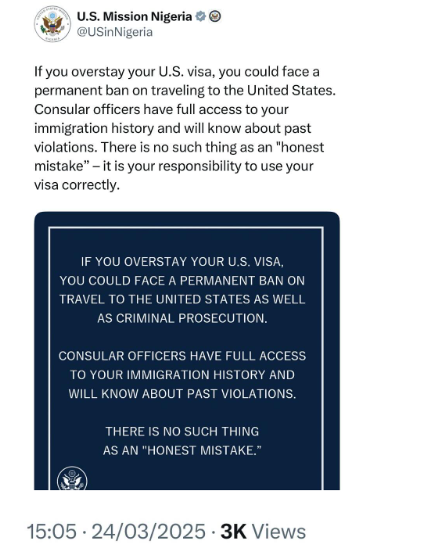 In a post shared on X, the embassy said there is no such thing as an honest mistake whenever an erring visitor is apprehended. The commission mentioned that consular officers have full access to a visitor’s immigration history and will know about past violations.