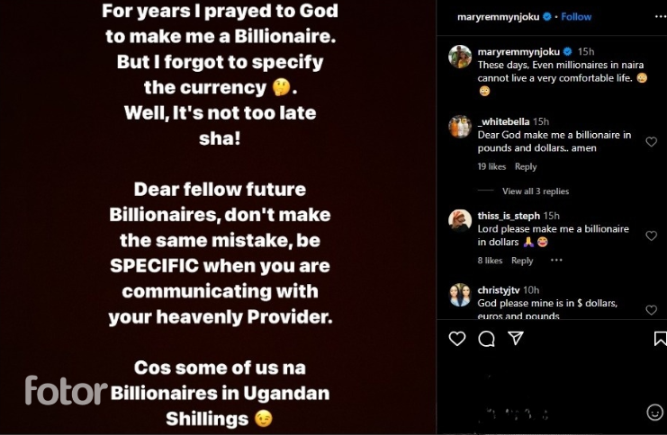 Her post reads: “For years I prayed to God to make me a Billionaire. But I forgot to specify the currency. Well, it’s not too late Sha!