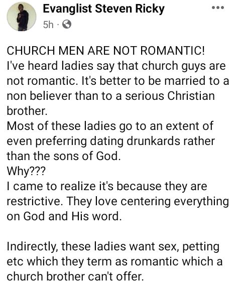 A Kenyan evangelist identified as Steven Ricky, has taken to Facebook to slam ladies who say they can’t be in a relationship with ‘church men’ because they are not romantic.