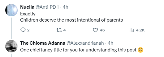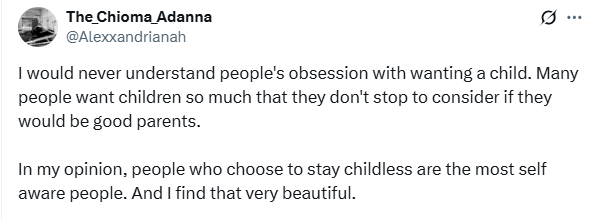 Adanna, who stated this on X said people who choose to stay childless are self aware; knowing well that they might not make good parents.