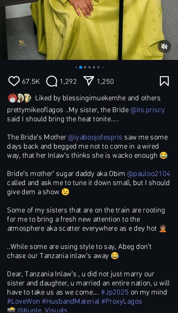 “My sister, the Bride @its.priscy said I should bring the heat tonite… The Bride’s Mother @iyaboojofespris saw me some days back and begged me not to come in a weird way, that her in-laws think she is wacko enough.
