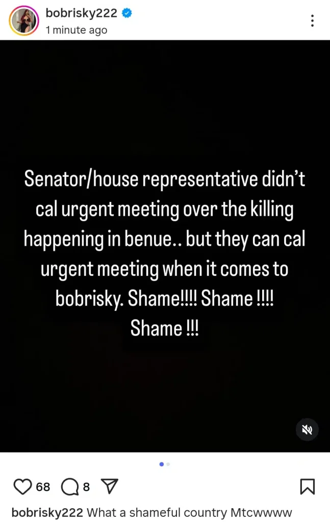 He wrote: “Senator/house representative didn’t call urgent meeting over the kiling happening in benue.. but they can call urgent meeting when it comes to bobrisky. Shame!!!! Shame!!!! Shame!!!”