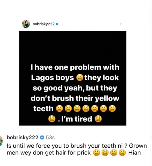 According to him, Lagos boys look good but do not brush their teeth.
