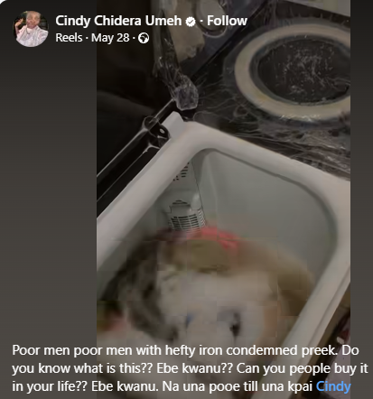 A Nigerian woman, Cindy Chiera Umeh, has mocked poor men while showing off her washing machine.
