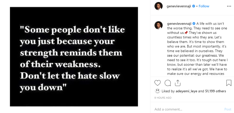 Admitting that life is tough here in Nigeria, the actress added that sooner than later we’ll have to realize it’s all we’ve got. Genevieve Nnaji also urged Nigerians to make sure all energy and resources are beneficial to all things in Nigeria as the signs can’t be ignored any more.