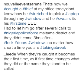 An IG user with the handle, @nouvelleeventsarena shared a photo of a young man who who stole a laptop through his office’ window, in Abuja. He cautioned business owners to be mindful of the way the leave their windows open during the day.