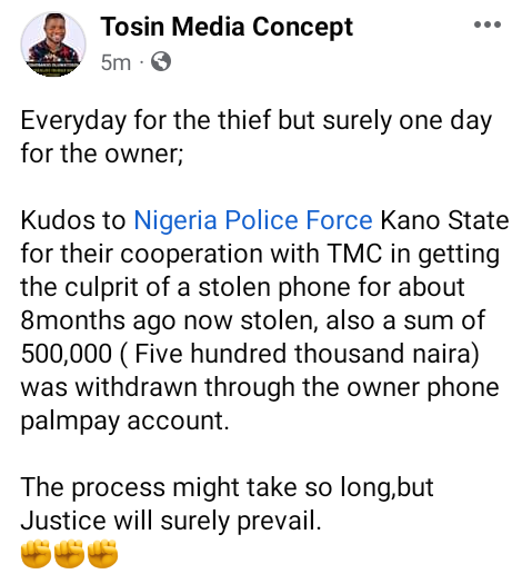 “Everyday for the thief but surely one day for the owner. Kudos to Nigeria Police Force Kano State for their cooperation with TMC in getting the culprit of a stolen phone about 8 months ago. Also a sum of 500,000 ( Five hundred thousand naira) was withdrawn through the owner’s phone palm pay account. The process might take so long, but Justice will surely prevail.”