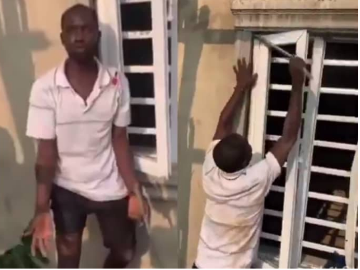 The video shows the suspect clinging to the window of the house as residents gathered around, compelling him to demonstrate step by step how he executed the break-in.