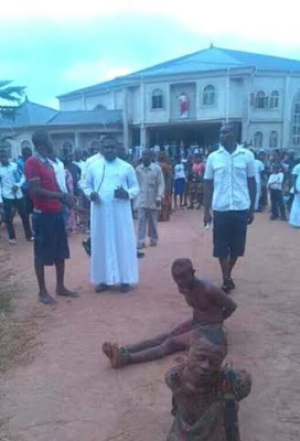 These two thieves were stripped naked and mobbed by angry worshipers at Sacred Heart Catholic Church in Ukunu Eziora Ozubulu, Nnewi Amabra state after they stole a motorcycle during the church’s 5.30am mass today September 27th. They were later handed over to the police.