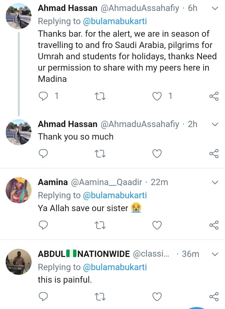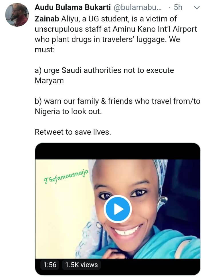 People are not calling for the release of Zainab Aliyu so that she will not be executed in Saudi Arabia. The penalty for drug trafficking in Saudi Arabia is DEATH!