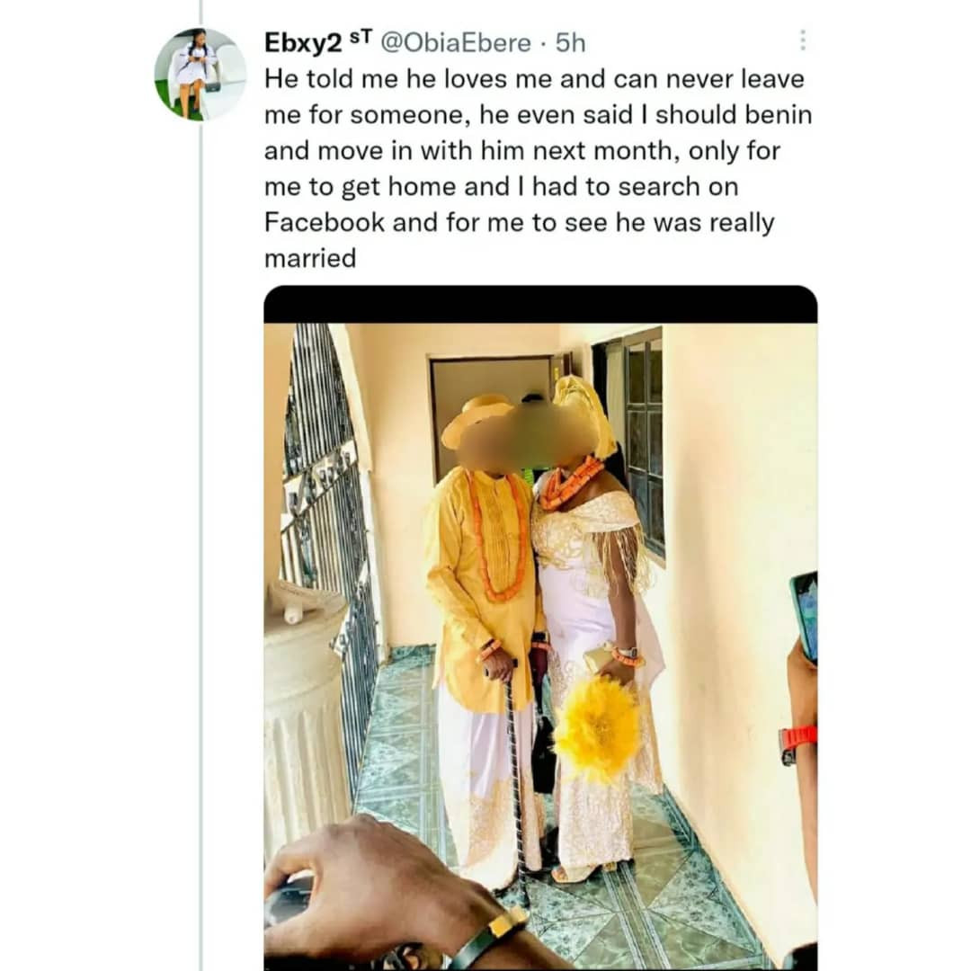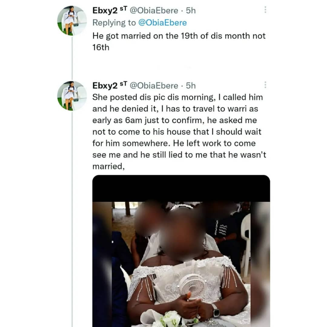 In a Twitter thread, Ebere said her lover was with her on the 16th and that three days later, he went on to marry someone else.