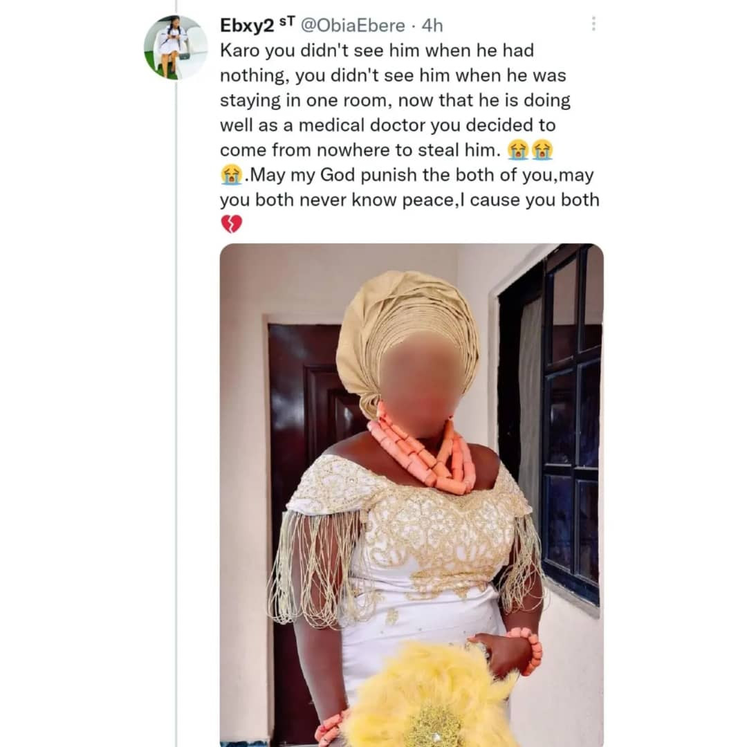 A devastated Ebere said she found more photos of his wedding to the other lady on Facebook. She cursed the couple for bringing pain to her.
