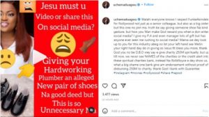 “I give my P.A and even manager lots of gift but has anyone ever seen me rushing to social media? Mama we dey look up to you for this industry abeg no let your left hand see Wetin your right-hand dey do in giving so Jesus fit bless you more, thank God you no be O.B.O wey say e give charity 250M spiritually”