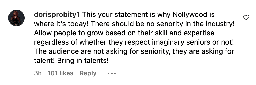 “This your statement is why Nollywood is where it’s today! There should be no senority in the industry! Allow people to grow based on their skill and expertise regardless of whether they respect imaginary seniors or not! The audience are not asking for seniority, they are asking for talent! Bring in talents!” a user wrote in reaction.