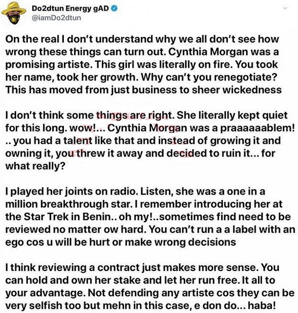 Read his tweets below; On the real I don’t understand why we all don’t see how wrong these things can turn out. Cynthia Morgan was a promising artiste. This girl was literally on fire. You took her name, took her growth. Why can’t you renegotiate? This has moved from just business to sheer wickedness