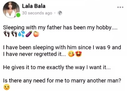 A Facebook user named Lala Bala has taken to her Facebook page to make a post. The post seems to be disturbing because it is considered as incest to many.