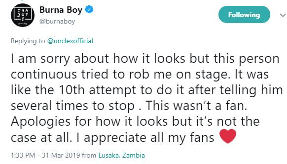 Nigerian singer, Burna Boy has reacted to a viral video showing him stomping and kicking a fan while he was performing on stage in Zambia last night.