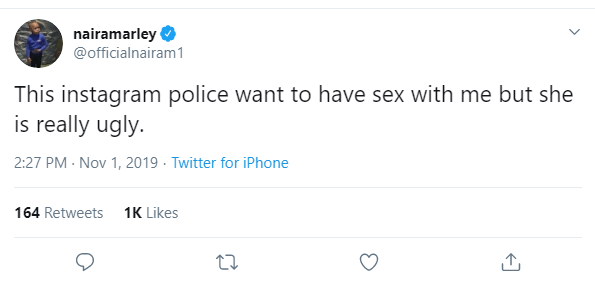 “This Instagram police want to have sex with me but she is really ugly.”