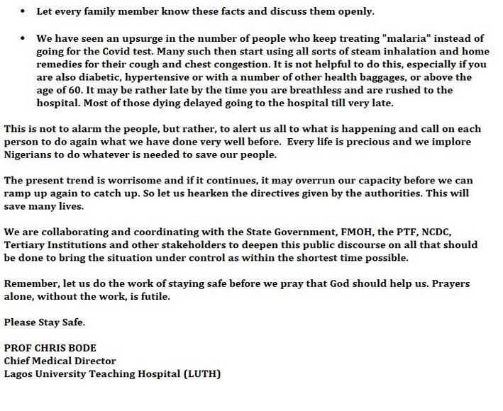 The hospital in an advisory issued by its Chief Medical Director, Professor Chris Bode, warned Nigerians to take very seriously all the COVID19 protocols.