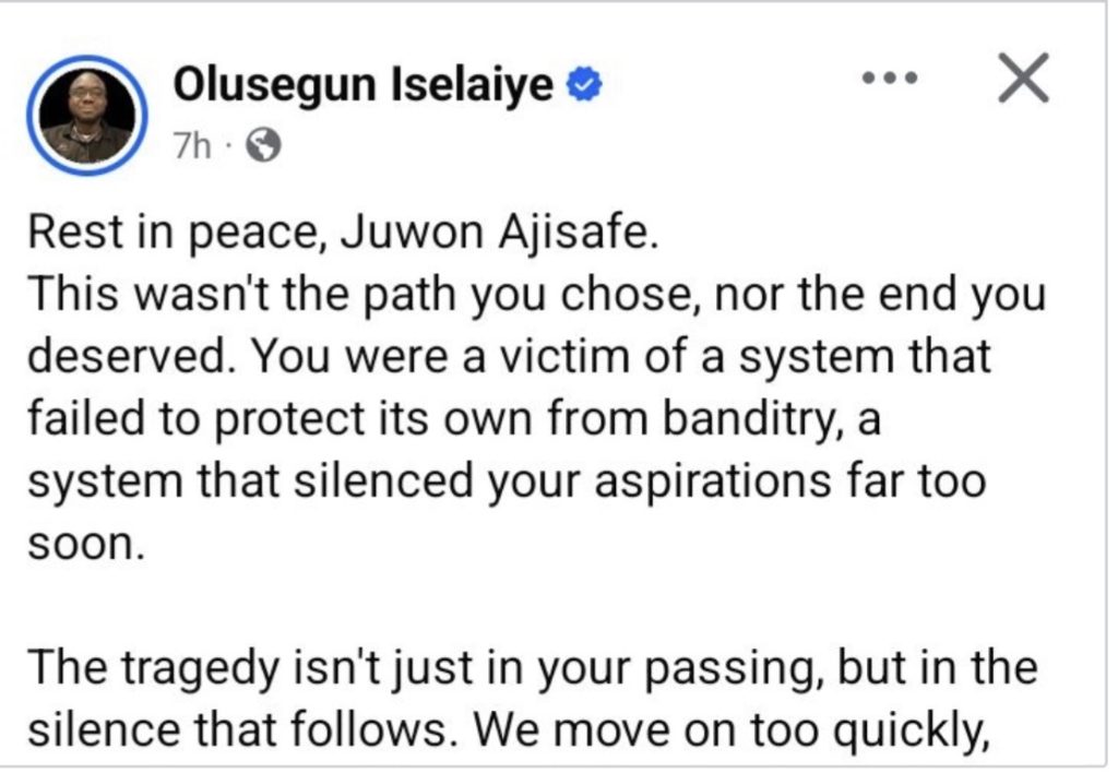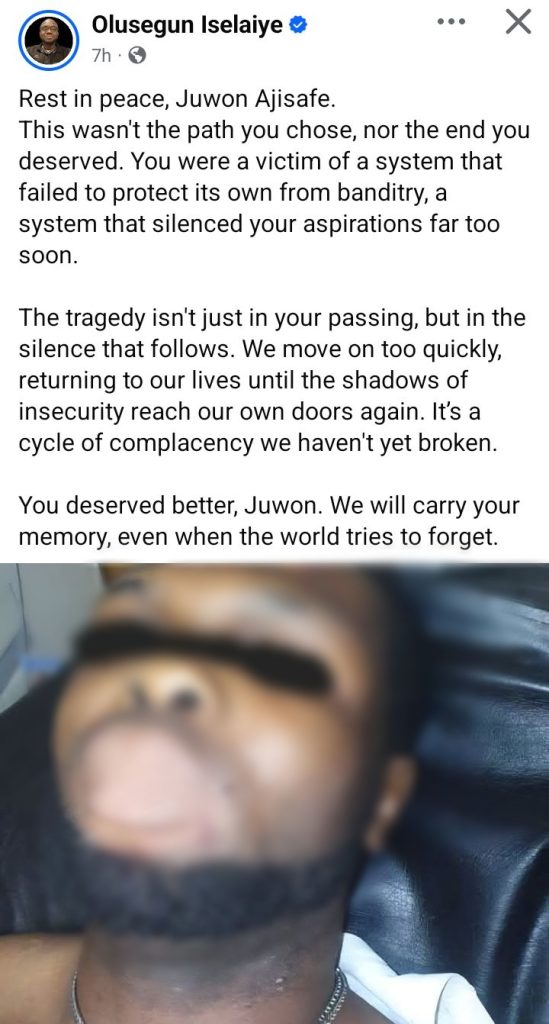 A Facebook user, Olusegun Iselaiye, has mourned a youth identified as Juwon Ajisafe, who was k!lled by armed bandits in Bareke, Egbe, Yagba West Local Government Area of Kogi State.