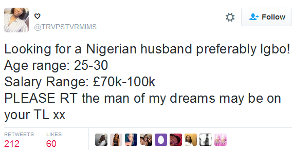 This young girl is looking for a Nigerian husband with salary range: £70-100k