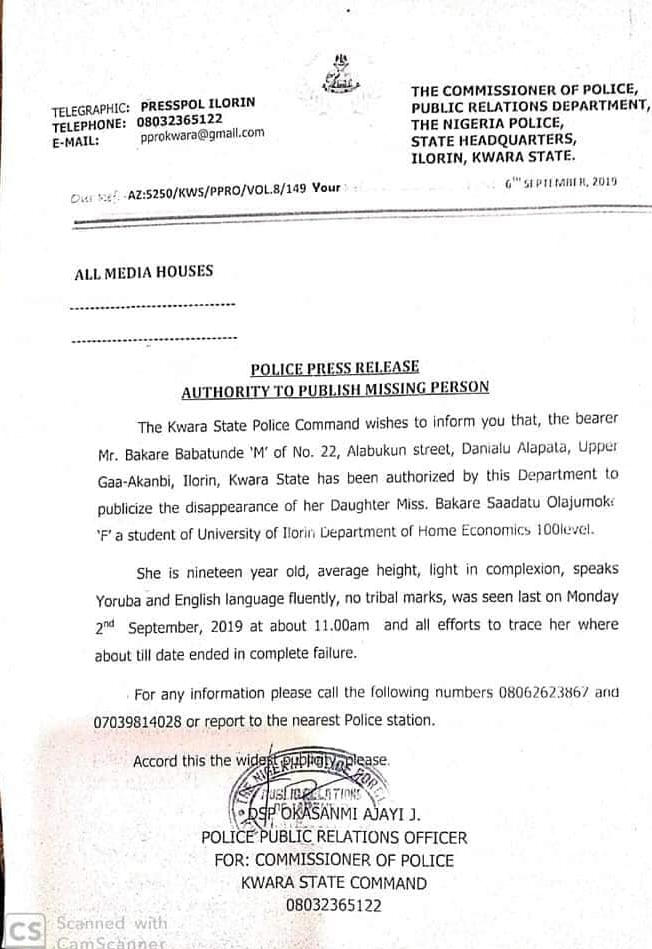 Please call any of these numbers if you have any information about her: 08062623867 or 08056678859