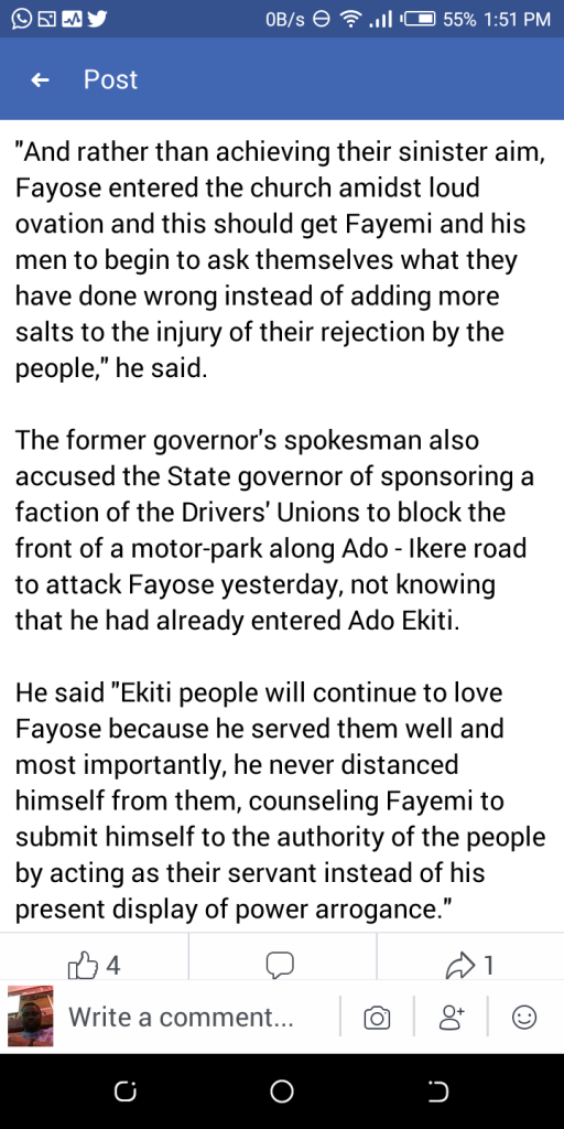 “And rather than achieving their sinister aim, Fayose entered the church amidst loud ovation and this should get Fayemi and his men to begin to ask themselves what they have done wrong instead of adding more salts to the injury of their rejection by the people,” he said.