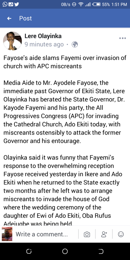 Media Aide to Mr. Ayodele Fayose, the immediate past Governor of Ekiti State, Lere Olayinka has berated the State Governor, Dr. Kayode Fayemi and his party, the All Progressives Congress (APC) for invading the Cathedral Church, Ado Ekiti today, with miscreants ostensibly to attack the former Governor and his entourage.