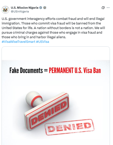 The United States government has warned Nigerians that individuals who engage in visa fraud, including the use of fake documents, will be permanently barred from entering the country.
