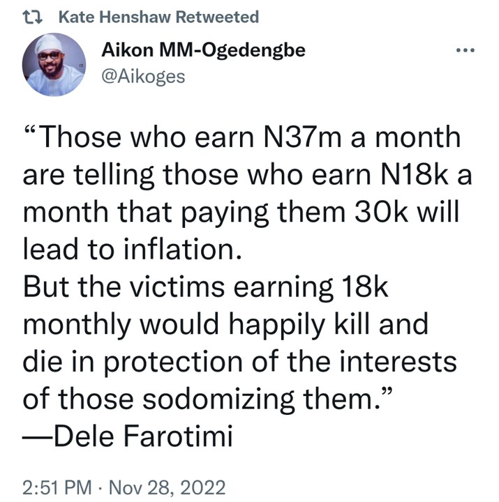 Those who earn N37m a month are telling those who earn N18k a month that paying them 30k will lead to inflation.