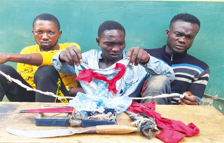 Men of the Ogun state police command have arrested three suspected cult members identified as Olagboye Abidemi, 32; Olasemojo Michael, 28; and Wasiu Waheed, 23, who were caught with a female pant allegedly tied with charms in the Sagamu Local Government Area of Ogun State.