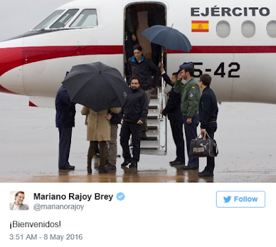 Acting Prime Minister Mariano Rajoy tweeted “Welcome!” in Spanish, accompanied by a photograph of the three men arriving.