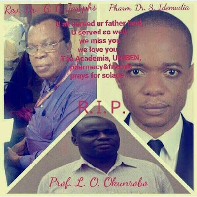 The three lecturers were in the Department of Pharmacy and that they were returning from Awka, the Anambra State capital. Then university’s management gave the names of the deceased lecturers as Prof. Lucky Okunrobo, Head of Pharmaceutical Chemistry; Dr. Godwin Joseph, acting Head of Pharmaceutical Microbiology and Dr. Saturday Idemudia, Assistant Lecturer in the Department of Pharmaceutical Microbiology.