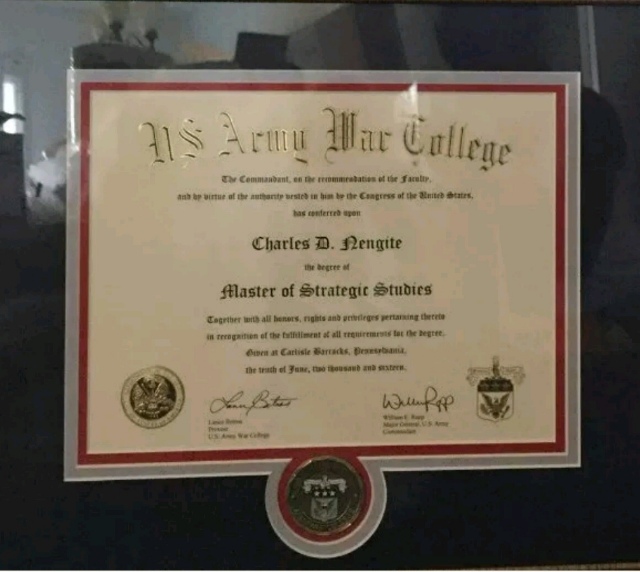 Mr. Rapp also said at the graduation ceremony of the college that Nigeria should be proud of Mr. Nengite and his compatriot in the Masters of Strategic Studies class, Col. Timothy Shipi.
