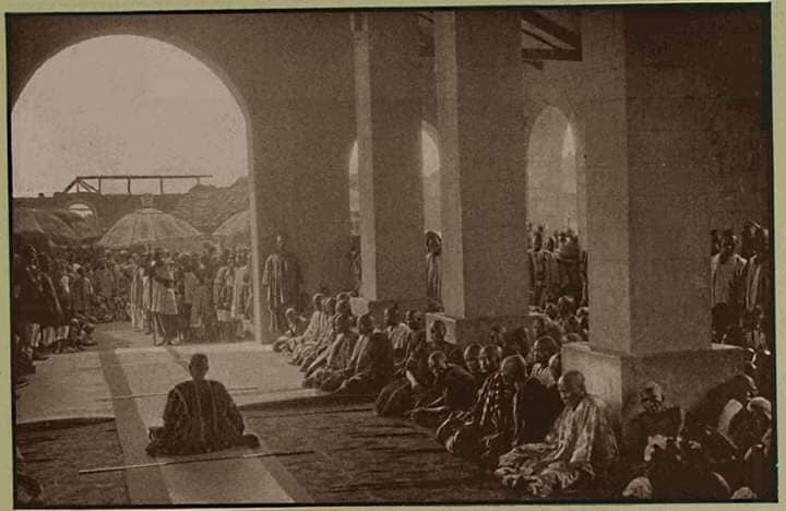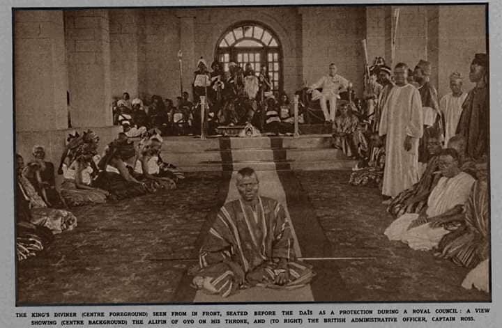 “A rare photo of a Diviner, Alaafin of Oyo & the almost legendary Capt. William A Ross. Who helped Alaafin of Oyo gain prominence again as paramount ruler of Yorubas- He was resident of Oyo 1914-1931. Ross was a friend of Alaafin Ladigbolu I. See how organized the palace is?”