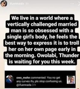 Ifu then fired back saying; ”We live in a world where a vertically married challenged married man is so obsessed with a single girls’ body, he feels the set way to express it to troll her on her own page early in the morning, Thunder is waiting for you this week”.