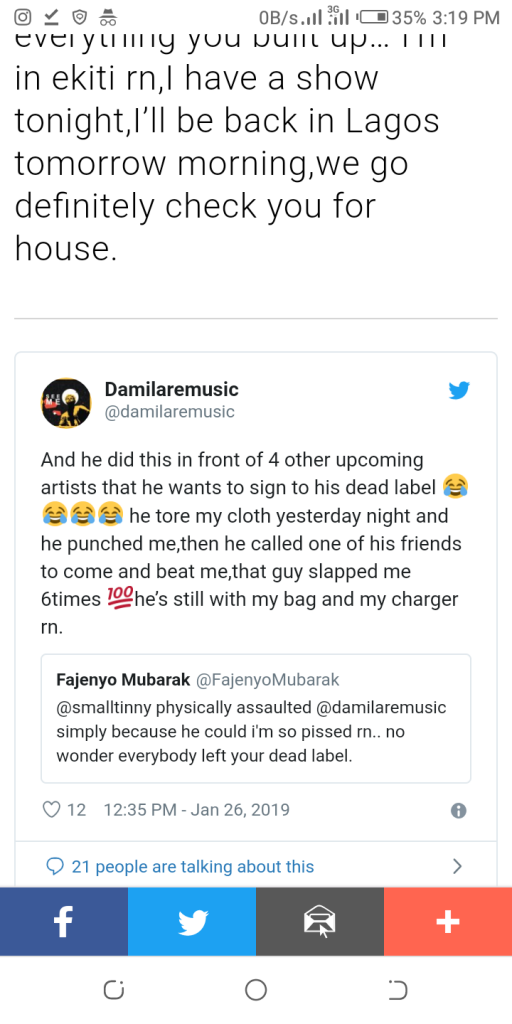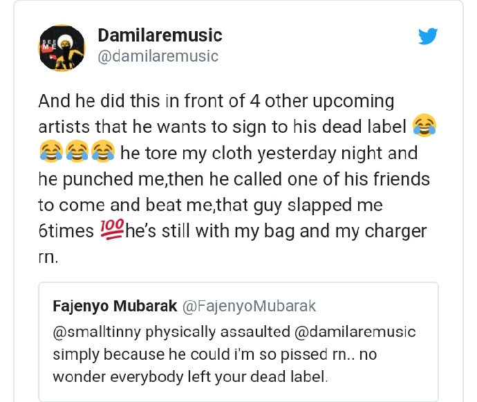 @smalltinny physically assaulted @damilaremusic simply because he could i’m so pissed rn.. no wonder everybody left your dead label.