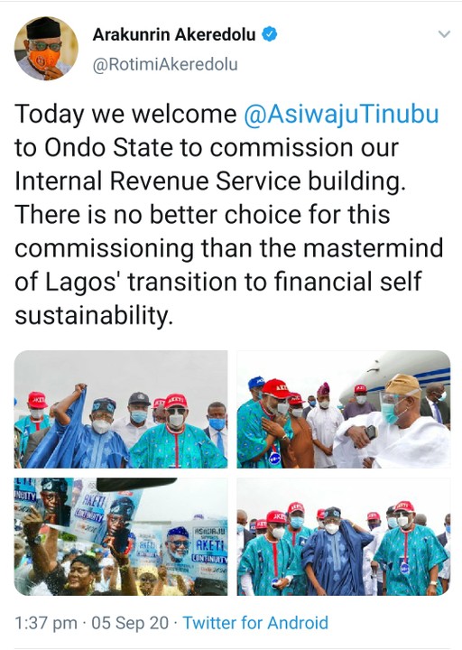 In his tweet, the Governor said: “Today, we welcome @AsiwajuTinubu to Ondo State to commission our Internal Revenue Service building. There is no better choice for this commissioning than the mastermind of Lagos’ transition to financial self sustainability.”