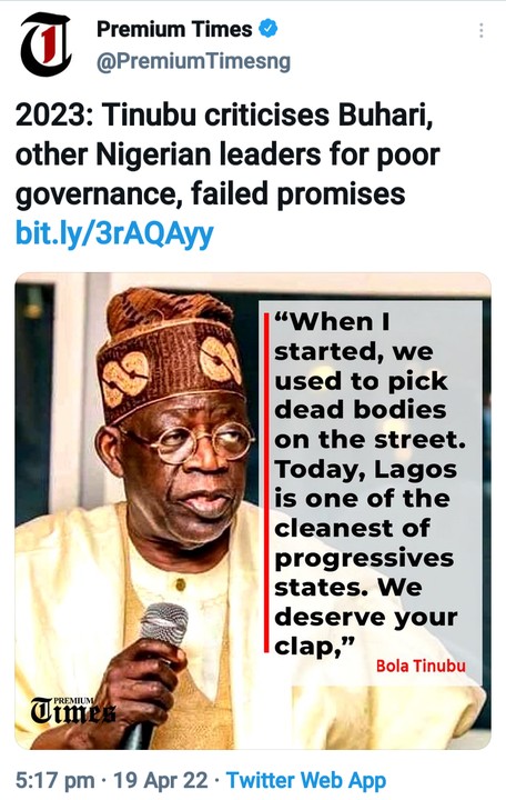 PREMIUM TIMES reported the earlier claim by the former governor while addressing some participants at the APC’s Women Conference in Abuja in January. On Saturday, Mr Tinubu repeated the claim.