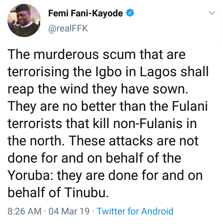 Fani Kayode on his Twitter page on Monday described those terrorizing Igbos as ‘murderous scum’.