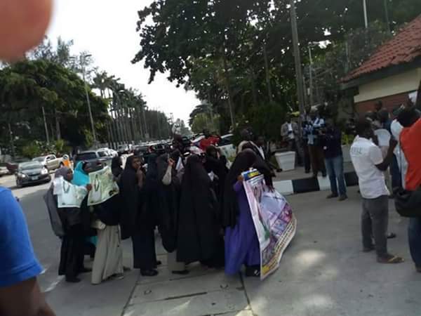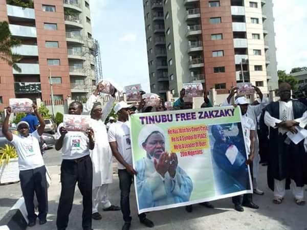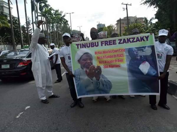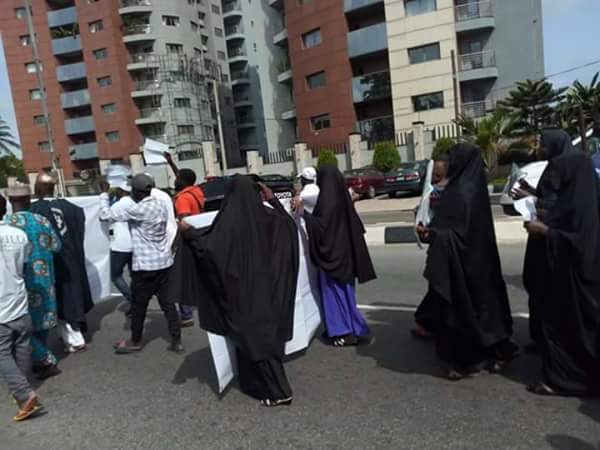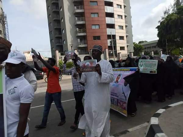 Shia Muslims today staged a protest in Victoria Island,Lagos demanding for the immediate release of Sheikh Zakzaky and wife from more than two years detention.They were pictured with placards with many inscriptions with one of them written ‘Tinubu Free Zakzaky’.
