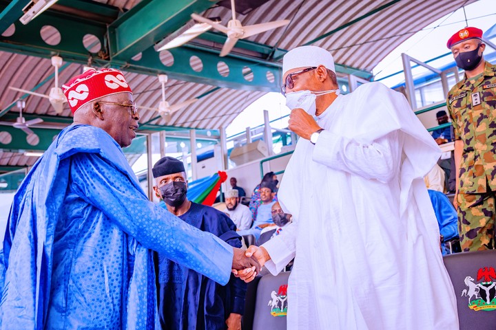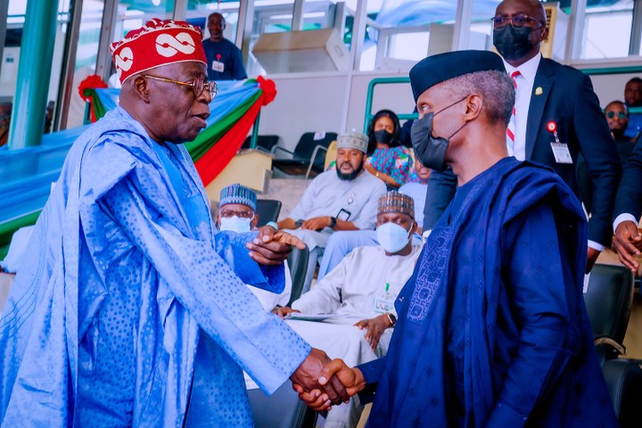 The All Progressives Congress presidential candidate, Bola Ahmed Tinubu has been spotted exchanging handshake with Vice President Yemi Osinbajo on Tuesday.