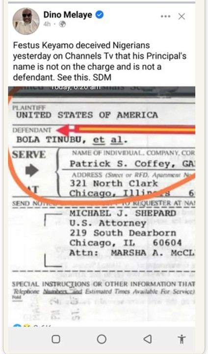Festus Keyamo deceived Nigerians yesterday on Channels Tv that his Principal’s name is not on the charge and is not a defendant. See this. SDM
