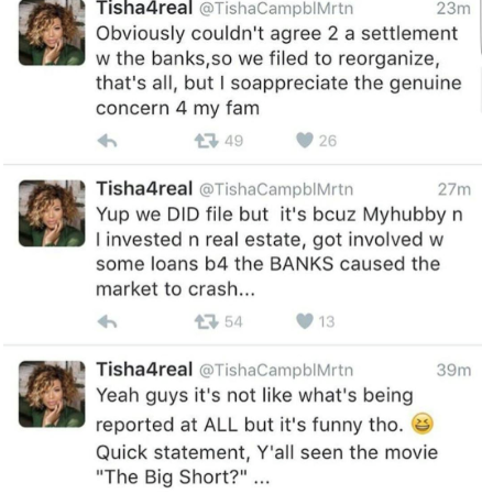 News leaked yesterday that actors Tisha Campbell and hubby Duane Martin were $15 million in debt and had filed for Chapter 7 bankruptcy. Tisha took to Twitter to explain why they did…