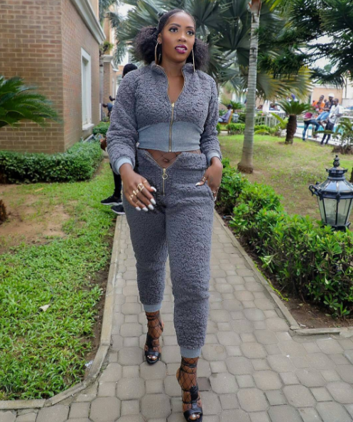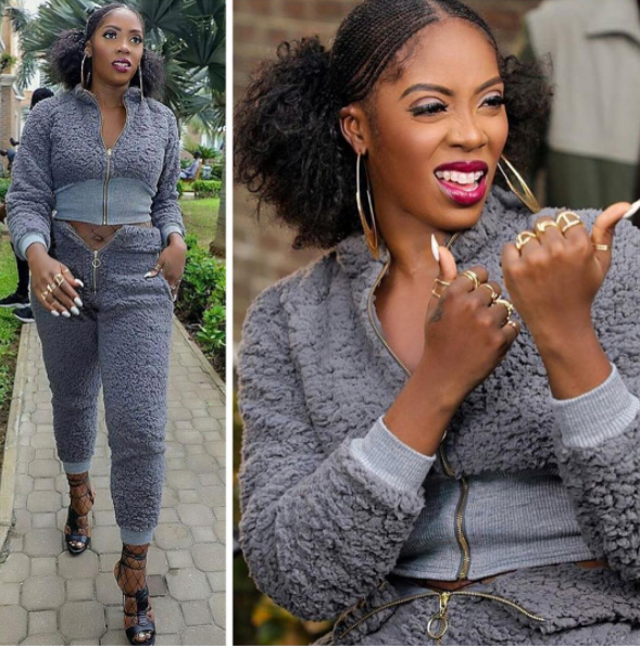 Tiwa Savageflashed her belly in this flurry outfit paired with a pantyhose for ”Informat’ video shoot with DJ KayWise. A hit?
