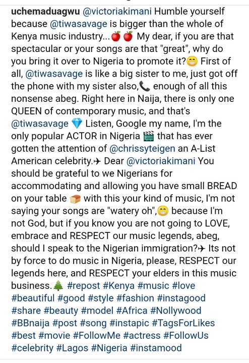 In reacting to the dispute between kenya musician Victoria Kimani and nigerian star Tiwa Savage, controversial actor Uche Maduagwu blast Victora Kimani said Tiwa Savage alone is bigger than the whole kenya music industry. He however send a note of warning to her.